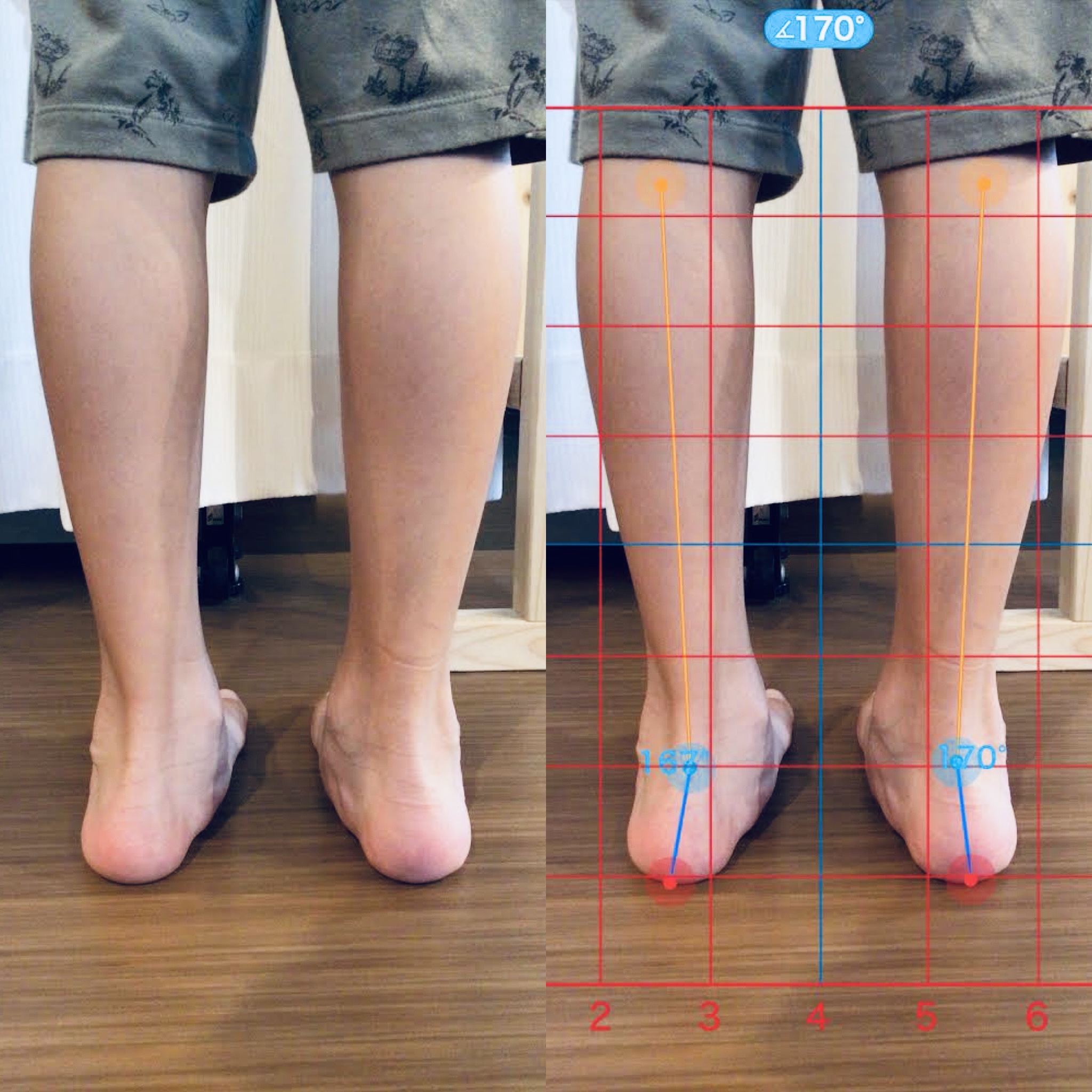 足の位置を合わせ、腰・背中・首・頭など、体がどのように傾いているか調べます。